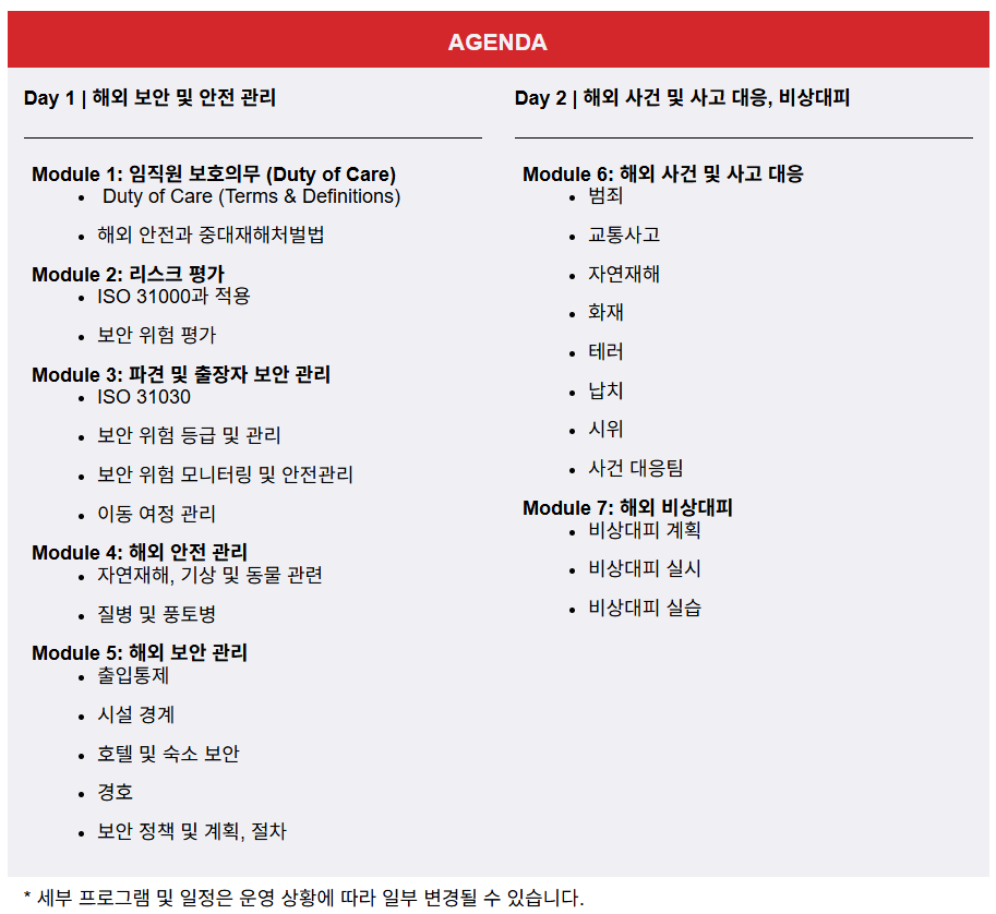 - 주제: 해외 사업장 및 파견자 안전·보안 실무교육 2일 집중과정